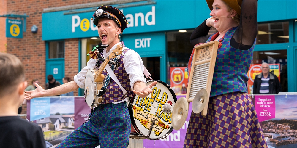 A traditional one man band joins a tap dancing, singing washboard player animating the space with joyful sounds of skiffle, jazz and blues.