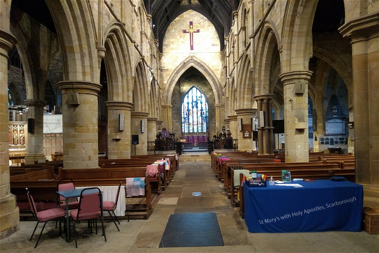 St Mary's Church stands high above the old town, just beneath Scarborough Castle. Building commenced in the 12th century, and the chancel was rebuilt about 170 years later. During the siege of Scarborough Castle in the Civil War, the churchyard was used as a base to fire cannons at the castle, with the castle returning fire which resulted in the destruction of almost the entire east end of the church apart from some ruins which still remain. What had been the central tower (at the east end of the present church) collapsed in 1645 and was rebuilt in 1670. At one time there were also two towers at the West end although they were later demolished. The church was rebuilt in the late 17th century and restored in the mid 19th century. The building has a series of stone vaulted side chapels on the south side. The internal walls are almost covered with late 18th century and early 19th-century wall monuments, including one by Roubiliac to Elizabeth Craven.